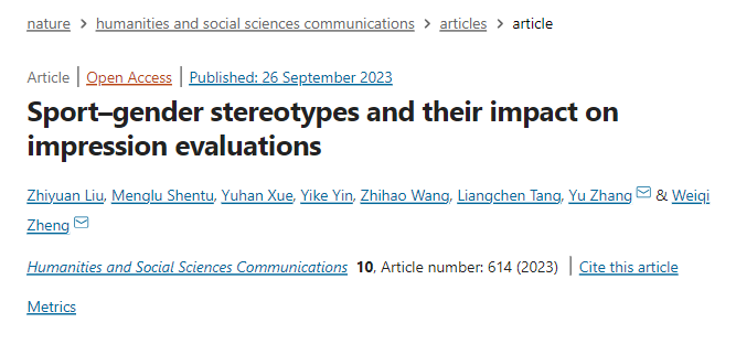 2023年9月26日,永利心理学院2020级本科生刘志远及其课题小组在该院张禹和郑玮琦老师的指导下,在国际顶级期刊《自然》(Nature) 的旗下期刊《人文与社会科学通讯》(Humanities & Social Sciences Communications) 发表了题为“运动-性别刻板印象及其对印象评价的影响”(Sport–gender stereotypes and their impact on impression evaluations)的研究论文。《Humanities & Social Sciences Communications》是Nature旗下唯一的人文社科综合类刊物,同时被A&HCI与SSCI收录,位列SSCI的Q1区序列。该刊致力于出版人文与社会科学所有领域的高水平研究,在国内外的人文社科领域具有重要影响力。