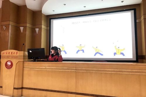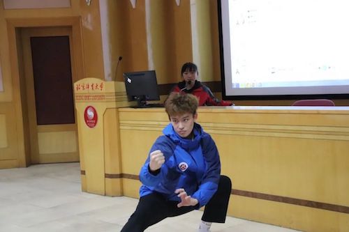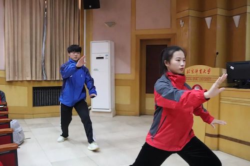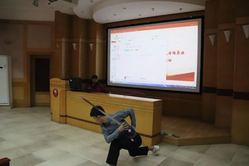 理论学习第一部分,第四期青马班助管、中国武术学院2018级本科生邵银霜做了武术推广宣讲。她从武术解释、武术简史、武术在以后的新发展新机遇三方面向同学们讲授了武术相关知识,并提出了对于传统武术和现代结合的期望。随后,武术学院的同学带来了一段精彩的武术表演。