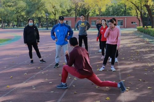 10月24日下午,体育课程教学活动田径培训在东田径场展开,中国田径运动学院2018级本科生曹丁可担任教练。