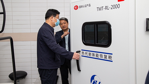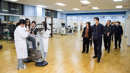 在运动医学与康复学院,游钧听取了学校师生保障精英运动员和开展社会服务的情况介绍,详细了解了学院在学科建设、人才培养、科技创新等方面的工作,查看了超低温冷疗室、4D虚拟动静态平衡实验室、姿态评估室等。
