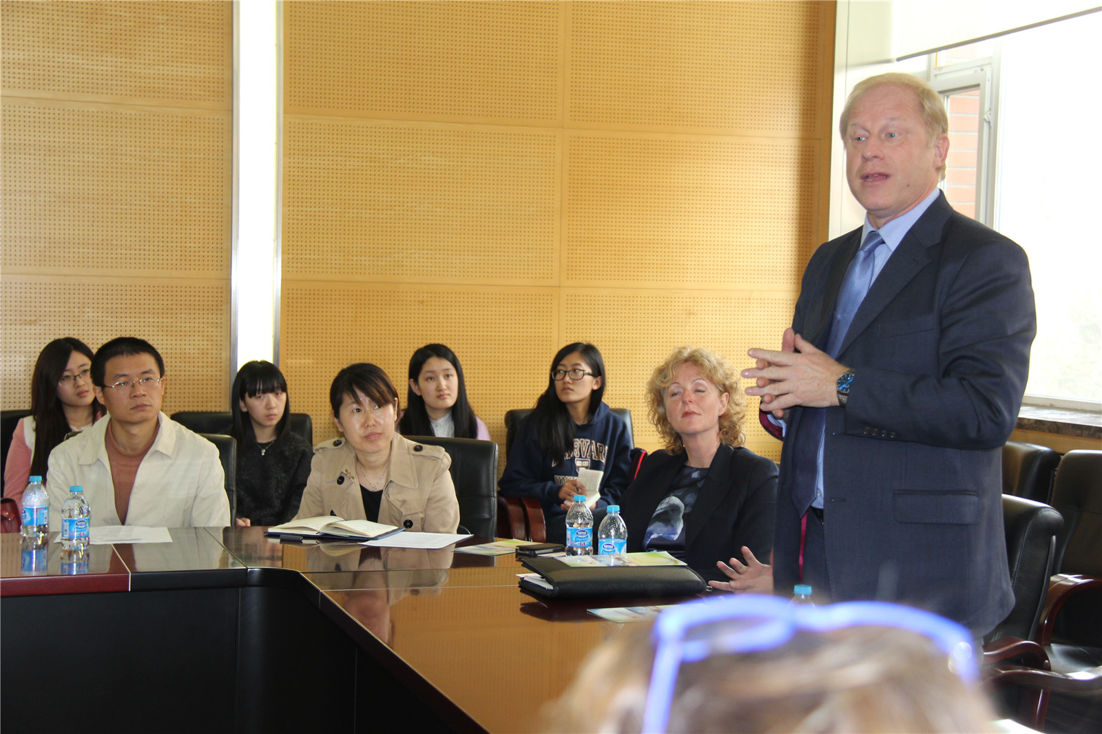 Philip.E.Wagner先生及代表团几位教授对该学院的体育管理项目进行了宣讲。出席会谈的还有管理学院党总支书记金春华、副院长林显鹏及数位教授,外事处董梅副处长、花勇民副处长和吴俊老师及部分研究生也参加了会谈,会谈气氛融洽,学术氛围浓郁。提问互动环节,大家踊跃参与。随后,代表团在董梅副处长的带领下参观了网球馆和教学实验楼。
