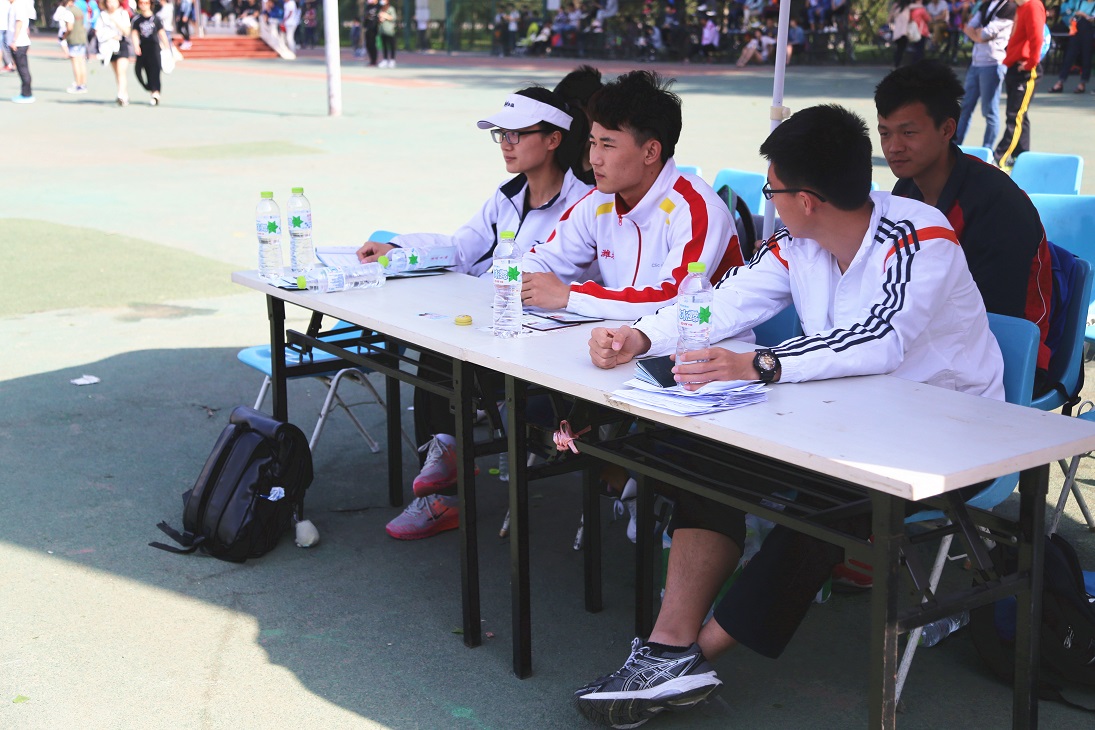 田径场上,烈日炎炎,裁判员们紧张地计时,精确到毫秒,全心全意保证比赛公平公正的进行,裁判工作虽然看似简单但是要求绝对细致严谨。编排公告组紧张地录入成绩,及时公布选手比赛成绩并将成绩提供给各相关工作小组。新闻中心分工明确,志愿者们认真履行各自工作职责,顶着烈日用镜头和文字将比赛的点点滴滴记录下来,通过大屏幕和校网及时将成绩对外报道宣传。学校安保人员始终坚守在各自的岗位上,维持赛场内外的安全秩序,确保运动会有序进行。场馆团队工作人员,总能及时出现在需要他们的地方,维修场地体育器械。后勤保障团队为其他工作组提供服务工作,是各部门坚实的后盾力量。