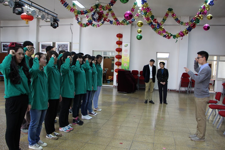 一切准备就绪后,挂牌仪式正式开始,离退休人员处的刘刚处长和关工委退休教师代表潘老师出席了本次活动。刘处长首先对我们的到来表示了欢迎,并高度赞扬体大同学的志愿服务精神,鼓励大家重在坚持。随后校学生会副主席李阳带领志愿者宣誓,保证尽自己所能,努力做好每一次活动。