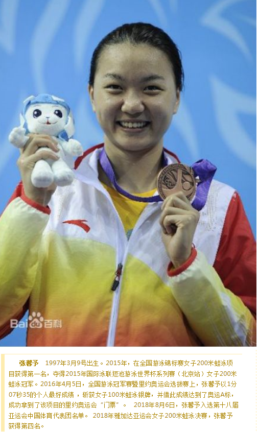 在8月20日举行的亚运会女子200米蛙泳决赛中,中国选手于静瑶以2分23秒31获得该项目亚军,永利竞技体育学院2017级学生张馨予以2分26秒24获得第四名。