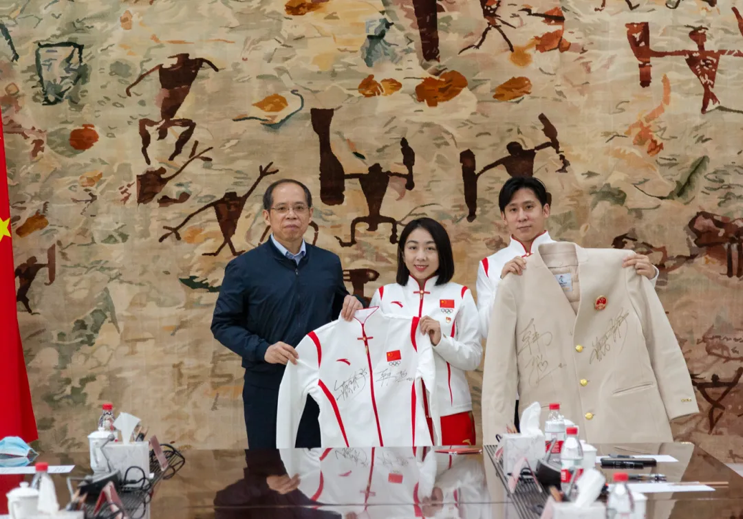 图|党委副书记、校长张剑代表学校接受隋文静和韩聪赠送的北京冬奥会入场服