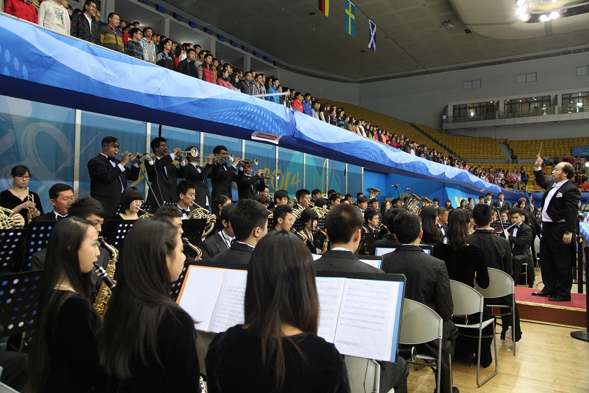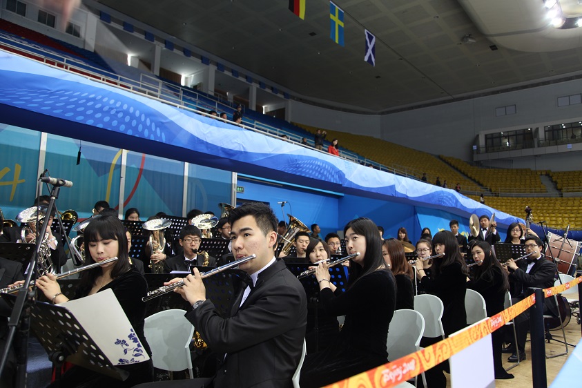 3月29日,“2014年世界男子冰壶锦标赛”在首都体育馆拉开序幕。为了下午正式演出的顺利进行,上午9时许,永利管乐团及志愿者们在团委书记周启迪老师的带领下出发前往首都体育馆,提前为下午的正式演出作准备。