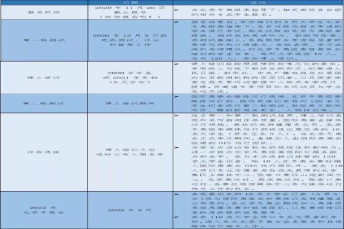 北京冬奥会奥林匹克信息服务大学生体育记者选拔训练营项目拟从北京、河北两地的8所中国知名大学选拔英语水平高、体育新闻写作能力强、热爱冬季运动、善于沟通、有高度团队合作精神的本科生或研究生,由国际奥委会媒体运行领域、冬奥组委媒体运行部和相关高校通过第一轮测试共同选出120人(每所高校15人),在2020年年底或2021年年初参加为期一周的课上培训,接受国内外资深体育记者和专家在文字、新媒体报道等方面的全面培训,并有机会与冬季项目知名运动员进行互动交流。在课上培训结束后,国际奥委会媒体运行领域、北京冬奥组委媒体运行部将对120名大学生记者进行第二轮测试。