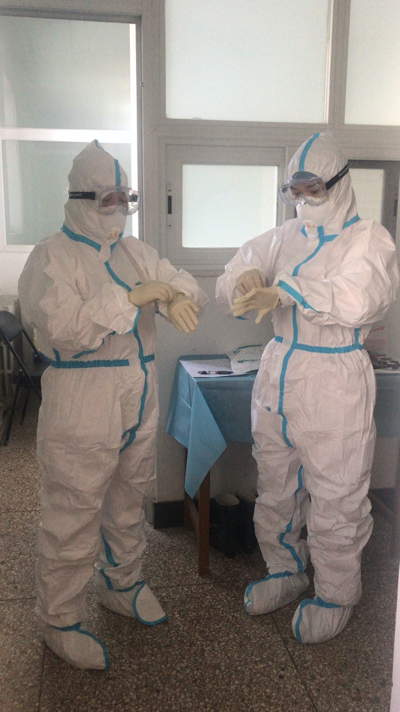 校医院医护人员穿着防护服进入临时观察点隔离区