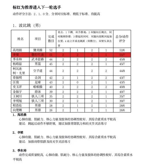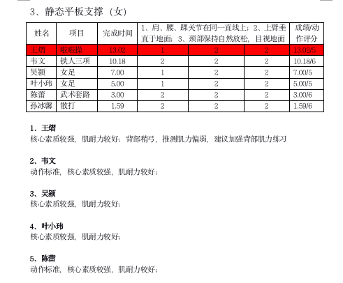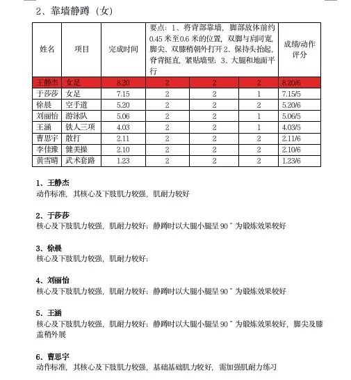 本次活动在内容上设置了多样化的动作比拼和专业化的技术支持。挑战项目包括静态平板支撑、静态深蹲和波比跳,队员从三项活动中自选一项进行录制并上传挑战视频,由运动人体科学学院及体能训练学院的专家评审老师分别从动作完成度、核心力量及肢体协调性、肌力水平、心肺耐力等方面进行评分,同时针对队员们的完成情况给出专业的指导建议。通过设计,在考验参与选手的力量、耐力、灵敏、平衡、协调、爆发力和柔韧性的同时,活动过程也趣味十足。